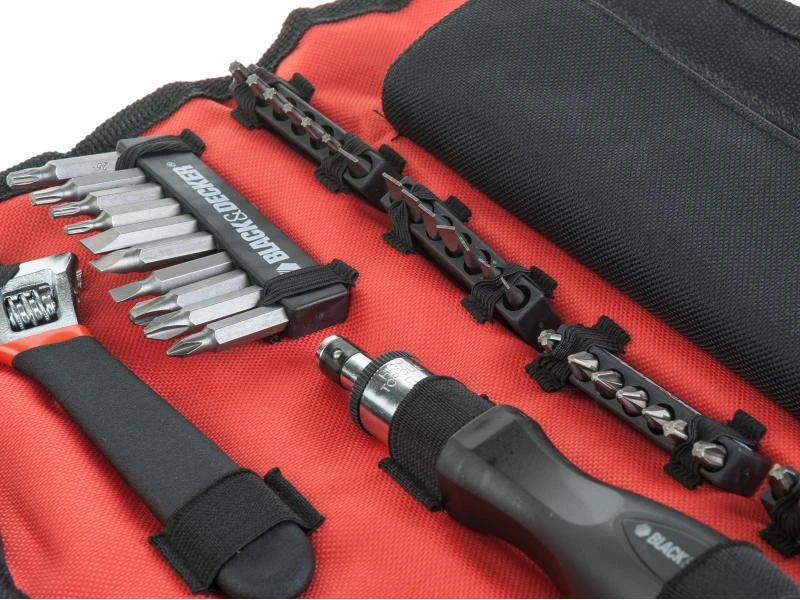 Die handliche Werkzeugtasche von BLACK+DECKER, vereint qualitative Werkzeuge mit Tragekomfort und geringem Platzbedarf. Das Set beinhaltet alle wichtigen Instrumente für heimische Reparaturarbeiten am Auto, Fahrrad und Motorrad. Zu allen geläufigen Schrauben befindet sich ein passendes Gegenstück im Set! Die 71 Bestandteile sind allesamt aus rostfreiem und belastbarem Stahl gefertigt und überzeugen in gewohnter BLACK+DECKER Qualität.