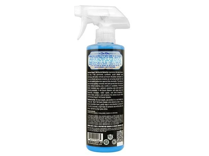 Eine praktische Lösung für einen ausdrucksstarken Tiefenglanz Ihres Fahrzeugs ist der Chemical Guys P40 Quick Detailer mit Carnauba. Der Detailer ermöglicht Ihnen die schnelle und schonende Aussenreinigung leicht verschmutzter Autos zwischen zwei Wäschen. Er entfernt Schmutz, Staub, Fingerabdrücke, Wasserränder, Vogelkot und Insekten ohne dabei Wirbel und Kratzer zu hinterlassen. Das Carnauba-Wachs versiegelt zugleich den Lack und schützt ihn vor schädlicher UV-Strahlung. Die Anwendung ist kinderleicht: Einfach den Detailer auf die zu behandelnden Oberflächen aufsprühen und trockenwischen. Das tolle Ergebnis wird Sie sofort überzeugen.
