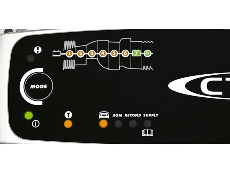 Schritt 1 – Entsulfatierung: Eine pulsierende Spannung entfernt Sulfat von den Bleiplatten der Batterie, wodurch die Batteriekapazität wiederhergestellt wird. Schritt 2 – Sanftstart: Prüft die Ladefähigkeit der Batterie. Bei korrektem Batteriezustand beginnt der Ladevorgang. Schritt 3 – Bulk: In diesem Schritt wird die Batterie mit Maximalstrom geladen, bis ca. 80% der Kapazität erreicht sind, Schritt 4 – Absorption: Laden mit schwächer werdendem Strom bis zum Erreichen von bis zu 100 % der Batteriekapazität. Schritt 5 – Analyse: Dieser Schritt prüft, ob die Batterie eine Ladung halten kann. Batterien, die ihre Ladung nicht halten können, müssen ggfs. ersetzt werden. Schritt 6 – Recond: Instandsetzungsfunktion für tief entladene Batterien. Schritt 7 – Float: Die Batteriespannung wird auf ihrem Maximalwert gehalten, indem sie mit konstanter Spannung geladen wird. Schritt 8 – Wartungsladung: Die Batteriekapazität wird bei 95 bis 100% gehalten. Das Ladegerät überwacht die Batteriespannung und gibt, sobald erforderlich, einen Ladeimpuls, um die Batterie vollständig geladen zu halten.