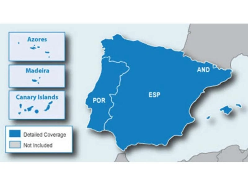 Spanien: Abdeckung 100%, mit Andorra, Gibraltar, Balearen und Kanaren, 740’122 km Strassen, 72’888 Points-of-Interest; Portugal: Abdeckung 95.27 %, 182’878 km Strassen, 9’575 Points-of-Interest