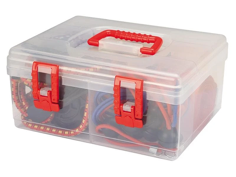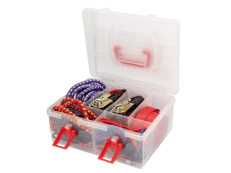 Mit dem 18-teiligen Perel Zurrgurt- und Gepäckspannset haben Sie nicht nur alles dabei, sondern auch griffbereit, denn die Box erleichtert das Sortieren der Gurte, Bänder und Haken. Das Bänder-Durcheinander nimmt ein Ende und sorgfältig aufgewickelte Gurte bleiben aufgerollt. Zudem lässt sie die Box an dem praktischen Griff leicht tragen.
