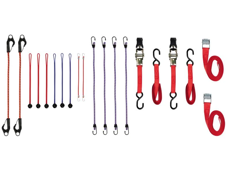 Dieses 18-teilige Set liefert alles, was Sie zum Befestigen und Festzurren brauchen. Neben zwei einzelnen Zurrgurten sind in der Box auch noch zwei mit Ratsche und Haken enthalten. Von den insgesamt 14 Gepäckspannbändern werden vier mit grossen Haken und zwei mit kleinen Haken geliefert. Zudem enthält das Set zwei Gepäckspannbänder mit Kunststoffhaken und sechs Gepäckspannbänder mit Kugel.