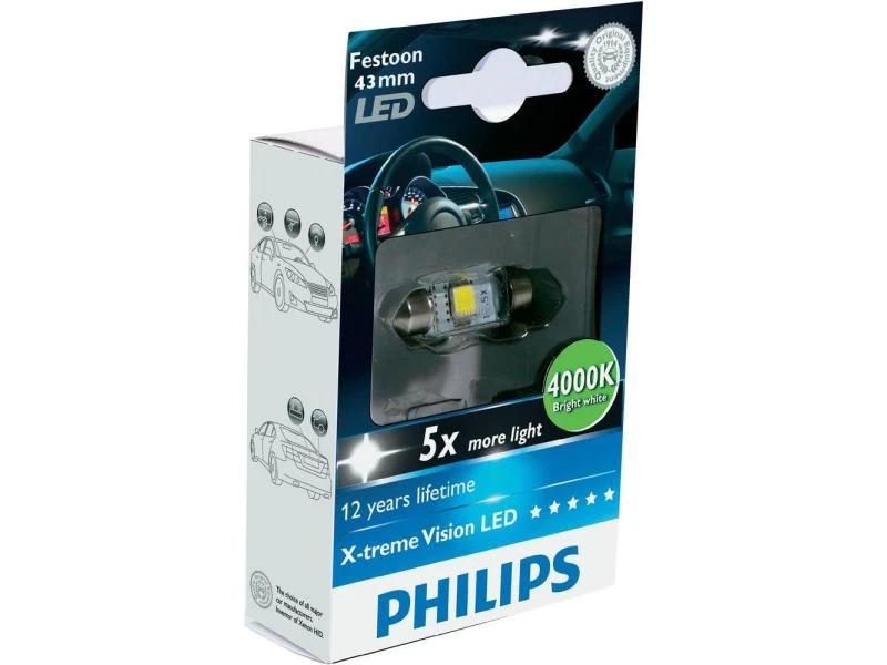 Die Philips X-treme Vision Leuchtmittel für die Innenraumbeleuchtung liefern bis zu fünfmal mehr Licht als herkömmliche Leuchtmittel. Die Leuchtmittel verfügen über Hochleistungs-LEDs, die den Innenraum mit kühlem, hellem und punktgenauem Licht erhellen, ohne den Fahrer zu blenden.