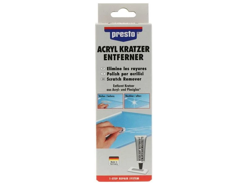 Oberflächen aus Acryl- und Plexiglas wie beispielsweise Scheinwerfer, Scheiben in Cabriolets, Wohnwägen oder Caravans, Windshields, Tachoabdeckungen oder Wurzelholz-Zierleisten verkratzen sehr leicht und verlieren so ihr gutes Aussehen und ihren Wert. Mit dem presto Acryl-Kratzer-Entferner lassen sich diese Kratzer wieder einfach und schnell beseitigen – aus Alt wird Neu! So wird eine teure Reparatur oder sogar ein Neukauf unnötig.