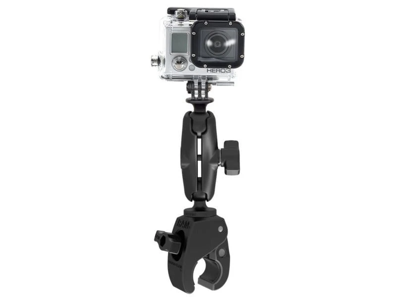 Die «GoPro Hero»-Halterung von «RAM Mount» besteht aus einer Tough-Claw-Basis, einem Verbindungsarm und der «GoPro Hero»-Halterung als Kopfteil. Sie kann an Rund-, Quadrat- und Flachformen verankert werden. Die Gummipolster der Basis verhindert das verrutschen auch bei starken Vibrationen.