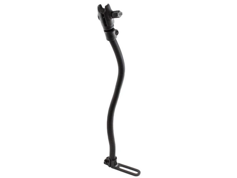 Das Halterungssystem vom «RAM Mount» ist modular aufgebaut. Jede Halterung besteht aus einer Basis (Base), einem Arm und einem Kopfteil (Top). Je nach Halterung werden diese miteinander verschraubt, meist aber über ein Kugelgelenk zusammengesteckt. Dies bietet Flexibilität in der Ausrichtung, sorgt aber zusammen mit dem Material für einen schock- und vibrationsdämpfenden Effekt.