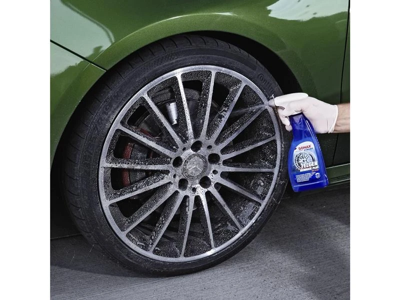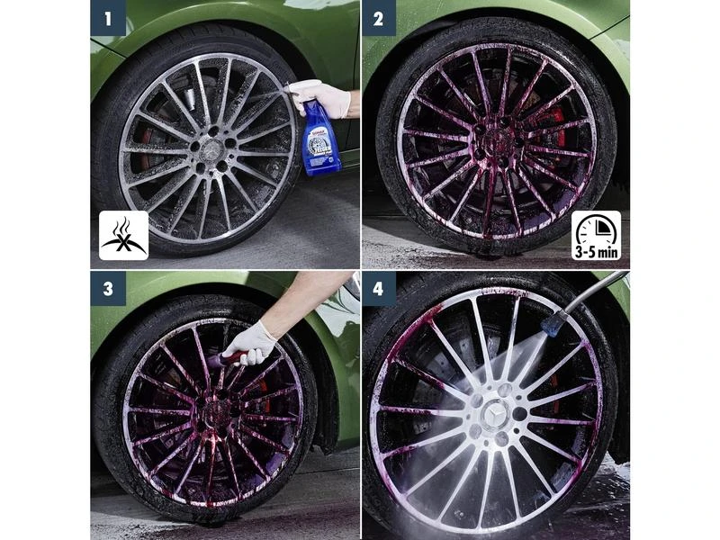 Flasche vor Gebrauch schütteln. Felge aus geringer Entfernung besprühen und 2 – 4 Minuten einwirken lassen. Die Farbe der Flüssigkeit ändert sich von farblos zu rot. Bei hartnäckigem Schmutz einen Schwamm oder eine weiche Bürste zu Hilfe nehmen. Abschliessend mit einem starkem Wasserstrahl oder einem Hochdruckreiniger gründlich abwaschen. BITTE BEACHTEN: Nicht in praller Sonne oder auf warmen Felgen anwenden. Felgenreiniger vor Frost schützen. Bedenkenlos bei verchromten und polierten Felgen einsetzbar.