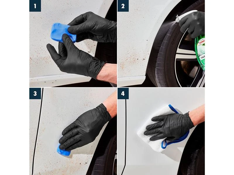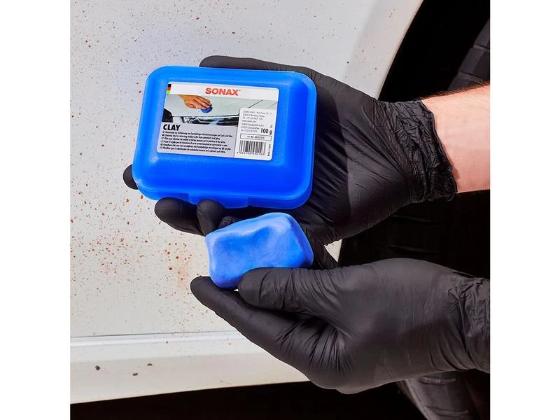 Spezielle, homogene Reinigungsknetmasse zur Beseitigung von Sprühnebel, Industriestaub, Flugrost, Baumharz, Teer, Insektenresten und sonstigen hartnäckigen Verschmutzungen von lackierten Autoteilen. Zur Anwendung mit 13052 SONAX ScheibenKlar. Leichte Anwendung: Nach der Autowäsche SONAX ScheibenKlar aufsprühen und das Clay leicht kreisend mit leichtem Druck über die Verschmutzung führen. Ist die Oberfläche des Clays verschmutzt, formt man eine neue, saubere Fläche.