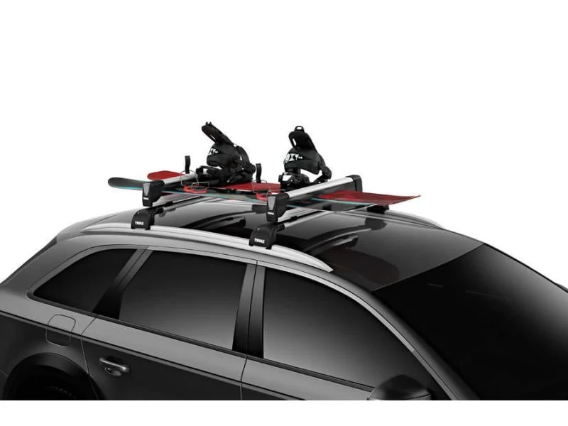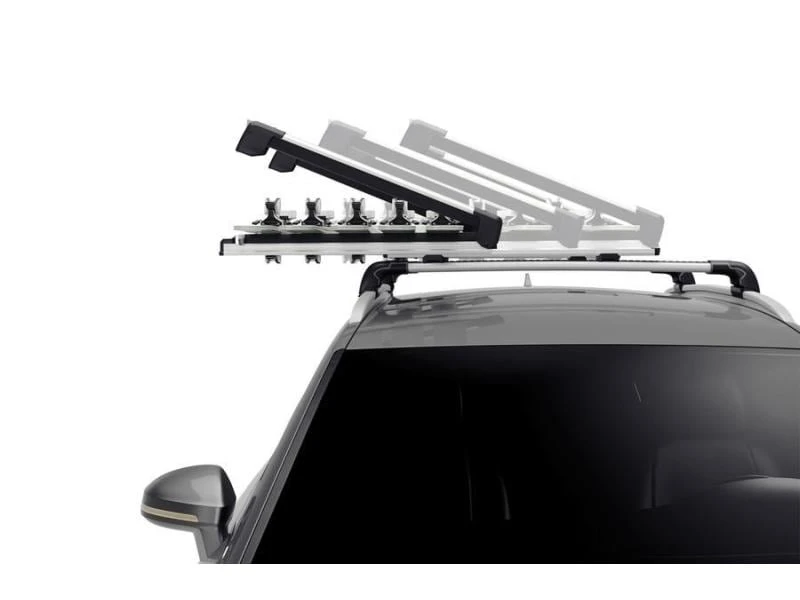 Der SnowPack Extender 7325 von Thule ist ein Skiträger, für den auch hohe Bindungen kein Problem darstellen. Die erhöhte Auflagefläche verhindert, dass erhöhte Skibindungen das Fahrzeugdach beschädigen. Zudem schützen weiche Gummipolster Ihre Skier und Snowboards während des Transports. Das Be- und Entladen ist dank ausziehbarer Träger besonders einfach. Ausserdem ist das Öffnen dank grosser Taste auch mit Handschuhen komfortabel. Auf der Ladefläche finden bis zu fünf Paar Skier oder 2 Snowboards Platz.