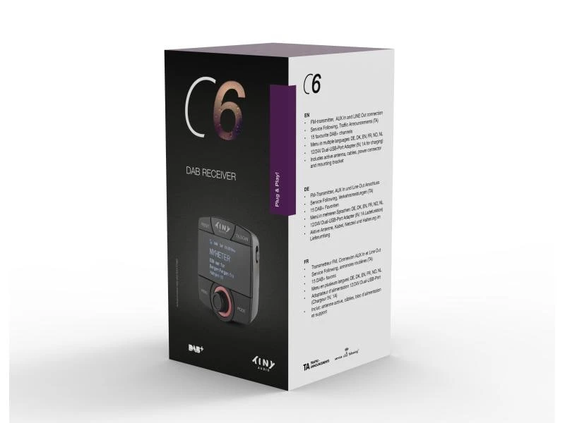 Der DAB+ Transmitter Tiny Audio C6 überträgt einfach und schnell das DAB+ Signal als Radiosignal via FM, in Ihr Autoradio. Stecken Sie ihn dazu in den 12 V-Anschluss Ihres Fahrzeuges ein und bringen Sie die hochwertige aktive Fensterscheiben-Antenne an. Der Receiver verfügt über einen stabilen Empfang und es entsteht dabei kein Rauschen. Das Display zeigt Kanal-, Titel- und Programm-Informationen an. Ein Anschluss über AUX In im Fahrzeug ermöglicht eine hohe Tonqualität. Mittels der TA-Funktion sind Sie immer über die aktuellen Verkehrsmeldungen informiert. Die einfache Installation sorgt für eine schnelle Inbetriebnahme des Geräts.