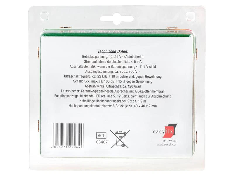 - 6 frei montierbare Hochspannungsplättchen mit Ausgangsspannung von 200 bis 300 V verjagen die Marder