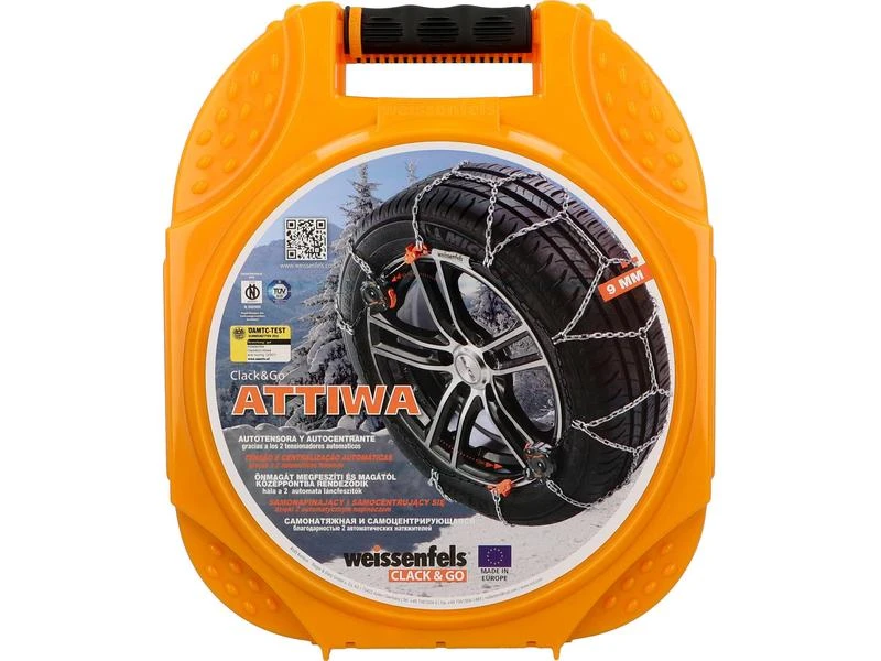 Die Schneekette für maximalen Fahrkomfort, selbst spannend und selbst zentrierend dank der zwei automatischen Spannungsvorrichtungen. Die Weissenfels-Schneeketten ATTIWA Clack & Go Schneekette 9 mm Gr.12 eignen sich für folgende Reifengrössen:
