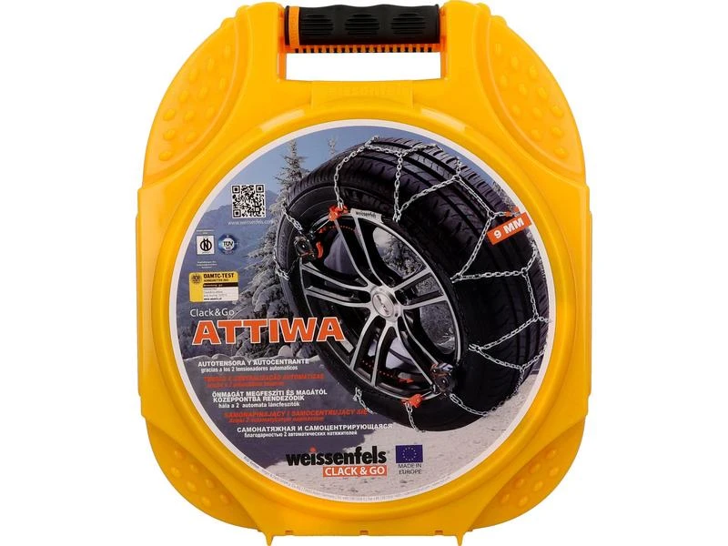 Die Schneekette für maximalen Fahrkomfort, selbst spannend und selbst zentrierend dank der zwei automatischen Spannungsvorrichtungen. Die Weissenfels-Schneeketten ATTIWA Clack & Go Schneekette 9 mm Gr.14 eignen sich für folgende Reifengrössen: