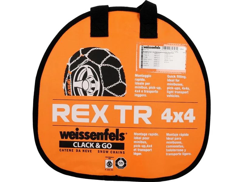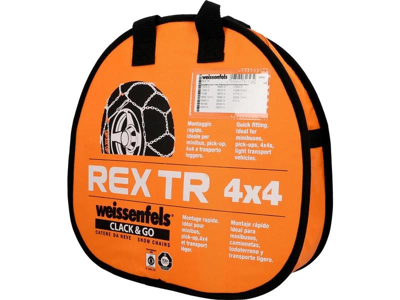 Die Kette mit professioneller Leistung und schnell zu montieren. Ideal für Minibusse, Pickup, 4 x 4 und Leichttransportfahrzeuge. Ersatzglieder und Plastikhandschuhe sind in der praktischen Aufbewahrungstasche inbegriffen. Die Weissenfels-Schneeketten TR 4 x 4 Gruppe 4 eignen sich für folgende Reifengrössen: